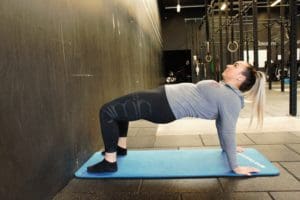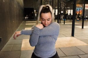 Tips: sørg for at albuen er 90 grader ut fra kroppen din, press deg selv forsiktig frem. Pass på å ha god kontroll på mage; så du ikke oppnår en kraftig svai i rygg.