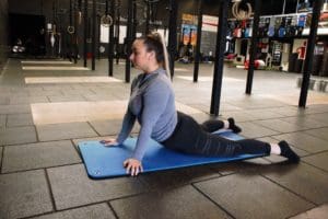 Tips: Sørg for at du lar hoften din falle ned mot gulvet: ikke hold igjen. Benet skal være langt bak deg. Legg gjerne vristen på foten din ned i bakken.