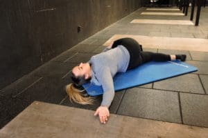 Tips: La hodet slappe av. Dersom det går greit å ligge i denne posisjonen som bildet viser kan du enten; legge armen som er til venstre på bildet i en 90graders vinkel ut fra kroppen, og/eller også sette den andre foten i bakken (Høyre ben på dette bildet) slik at begge fotbladene er i bakken.